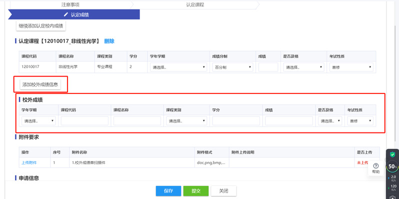 4、填写申请认定研究生课程具体信息及认定成绩;点击“添加校外成绩信息”,填写本科课程信息及成绩并上传附件。如图4所示。